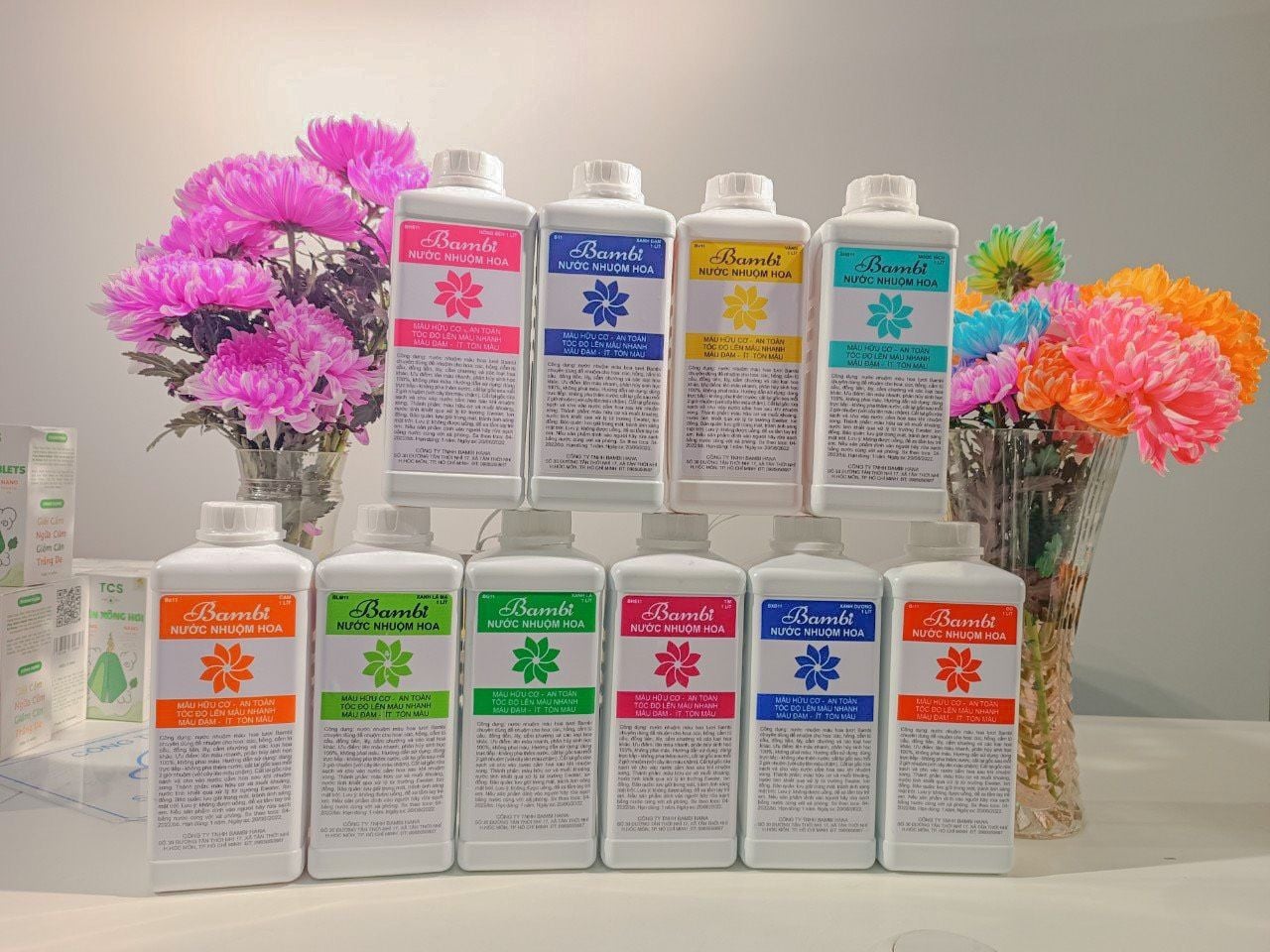 Nước nhuộm màu hoa hữu cơ Bambi chuyên dùng để nhuộm cho các loại hoa: Cúc, Hồng, Cẩm tú cầu, Đồng tiền, Lily, Cẩm chướng và các loại hoa khác.