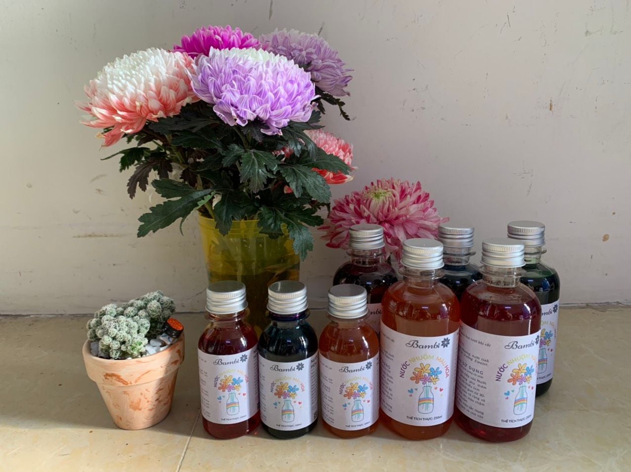 Nước nhuộm màu hoa hữu cơ Bambi chuyên dùng để nhuộm cho các loại hoa: Cúc, Hồng, Cẩm tú cầu, Đồng tiền, Lily, Cẩm chướng và các loại hoa khác.